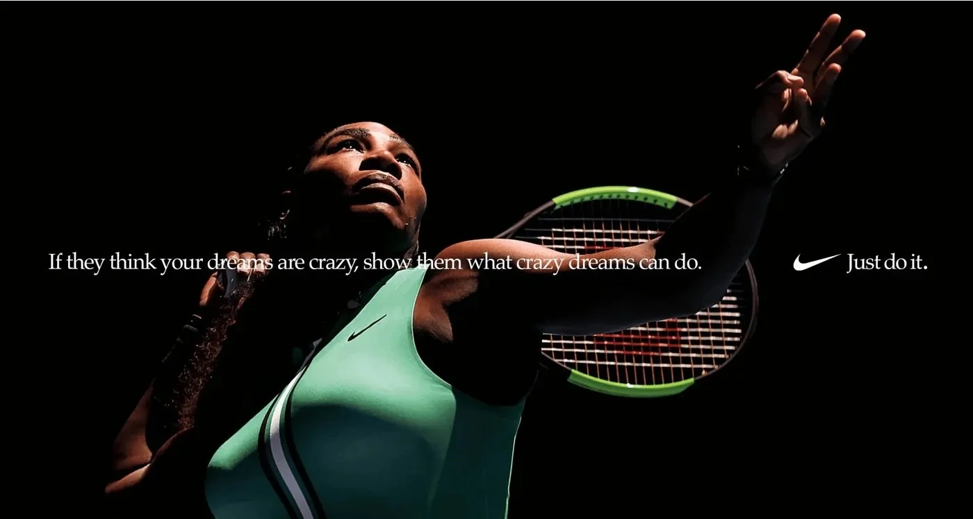 If you haven’t noticed yet, this is exactly what Nike is getting at with its “Dream Crazier” (2019) campaign narrated by Serena Williams. AKA, the legendary American tennis player who’s often faced public backlash, especially around issues of sexism. Stereotypes and social expectations have always been around, but in a world flooded with mass and social media, we’re more exposed than ever to society’s definition of the “ideal” female. Nike’s message? Challenge it. Rewrite it. Dream crazier.